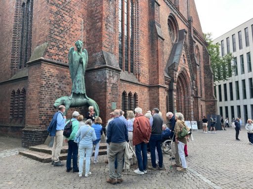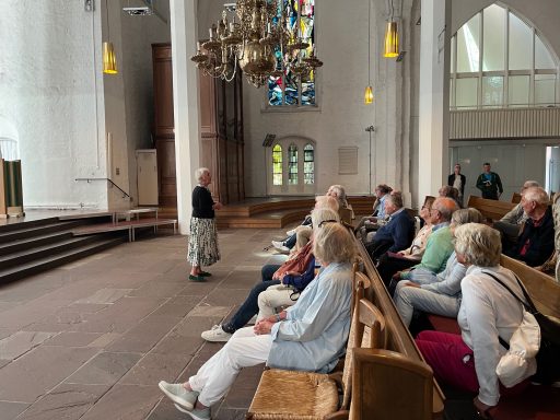 Die obligatorische "Ohnmachtsschnitte" im Anschluss gab es vor der Kulisse mächtiger Kreuzfahrtschiffe, hinter denen sich das Traditionsschiff MS Stadt Kiel eher schmächtig ausnahm. Vorbei an interessanten Skulpturen ging es dann weiter zur Nikolaikirche. Von außen allen bekannt, lernten wir sie bei einer sachkundigen Führung nun auch von innen näher kennen.