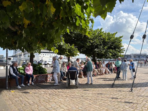 Idealer Ort für das traditionelle Kuchenbuffet und eine verdiente Tasse Kaffee war der Wiker Balkon, Blick auf die Förde mit auslaufender Color Magic inbegriffen. Gestärkt waren wir aufnahmefähig für weitere Informationen im "Maritimen Viertel". Im Anscharpark ging es entlang historischer Gebäude des ehemaligen Marinelazaretts, gelungen kombiniert mit moderner Wohnbebauung. In der früheren Technischen Marineschule gab es zu guter Letzt die Möglichkeit, sich mit der Geschichte des Nord-Ostsee-Kanals näher zu beschäftigen, bevor es zu einem gemeinsamen Abendessen in das an ebendiesem Kanal gelegene Restaurant Margaretental ging.